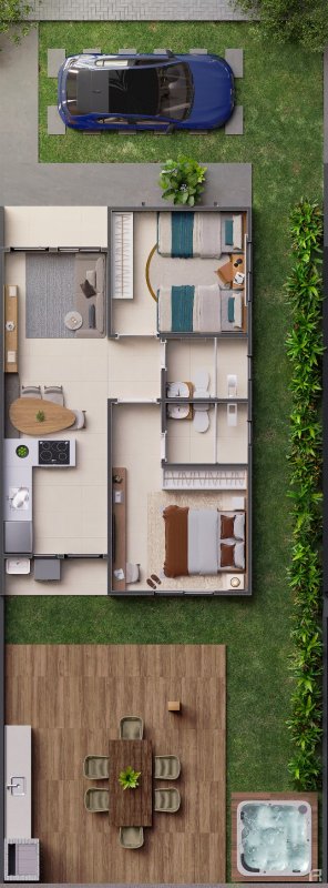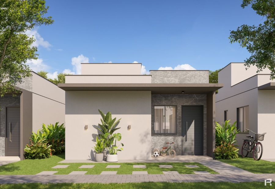 A casa é composta por dois dormitórios, sendo uma suíte bem iluminada, sala de estar com integração funcional, banheiro social e área de serviço. O imóvel conta ainda com jardim e uma vaga de garagem privativa.